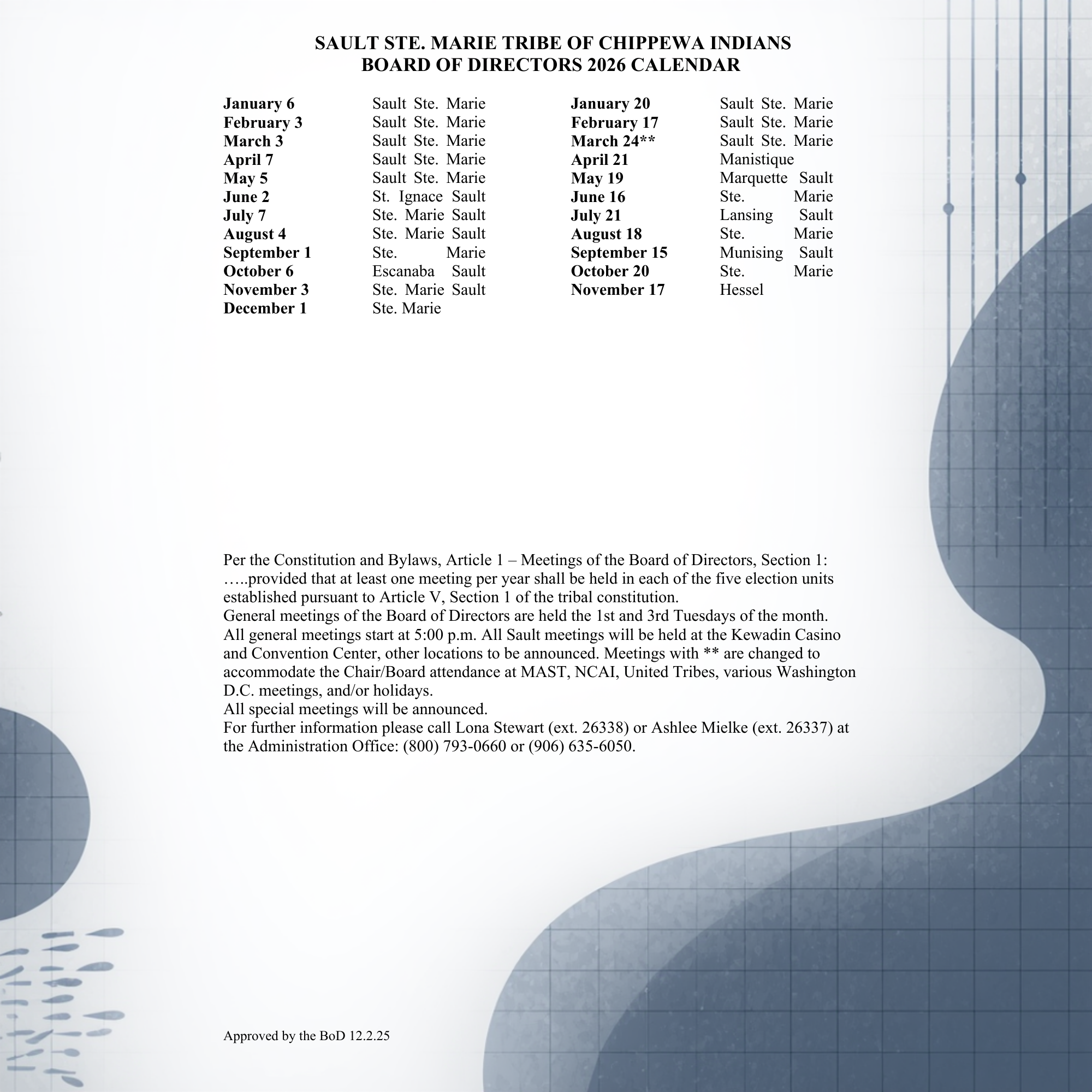 The Sault Tribe Board of Directors Meetings are at 5 p.m. EST at the Sault Kewadin Casino Whitefish Point Room or at a designated site as listed on the calendar, in person or via Zoom, https://zoom.us/j/83640619761.